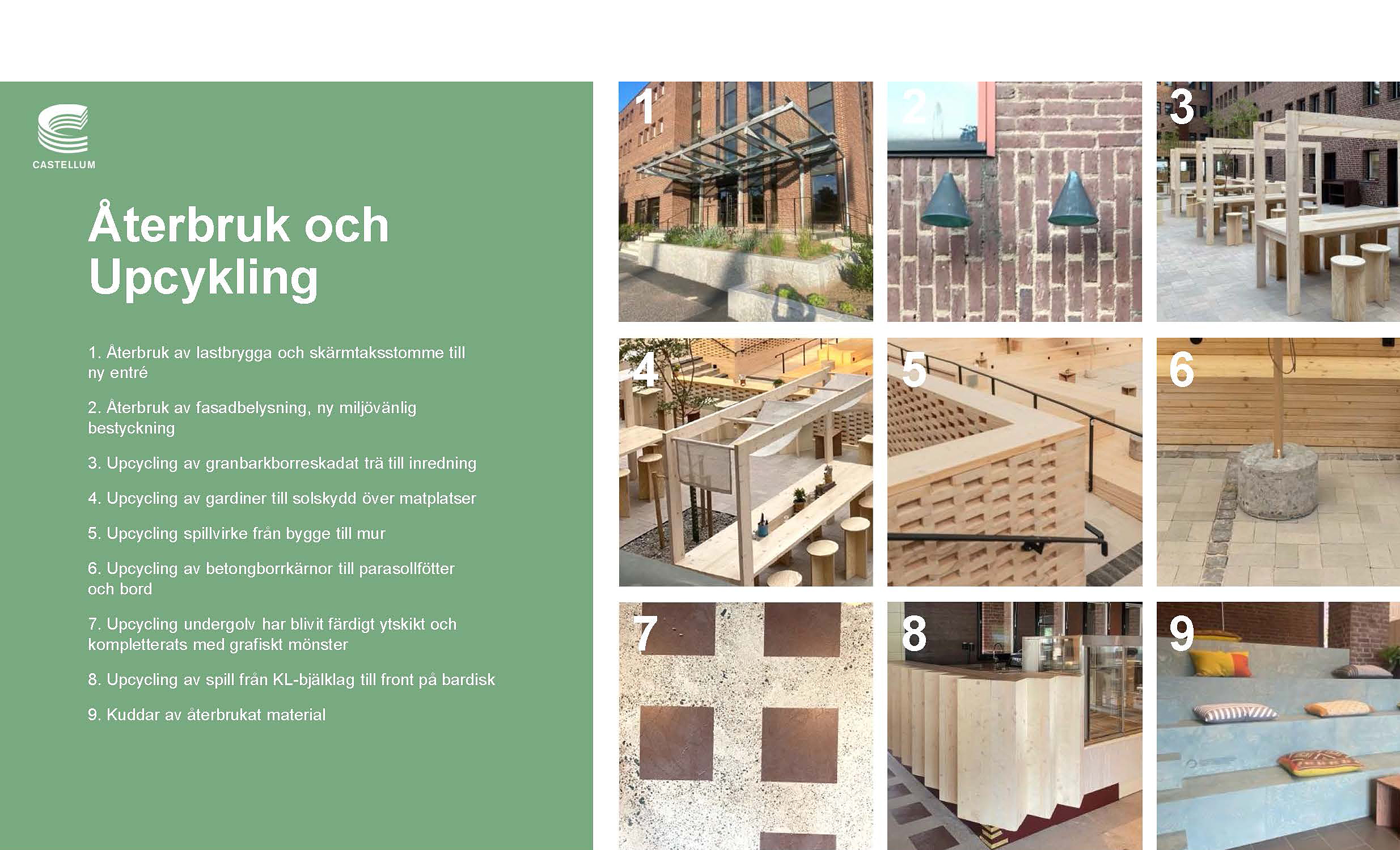 Exempel på återbruk är elstegar, kabelskenor, belysning som till stor del byggts om till LED, badrumsdörrar, glaspartier och kontorsdörrar. Radiatorer har målats och renoverats med nya koppel och termostater istället för att bytas ut. I restaurangen har vi jobbat med platsbyggda möbler tillverkade av granbarkborreskadat trä som kompletterats med återbrukade möbler och detaljer till en härlig mix.