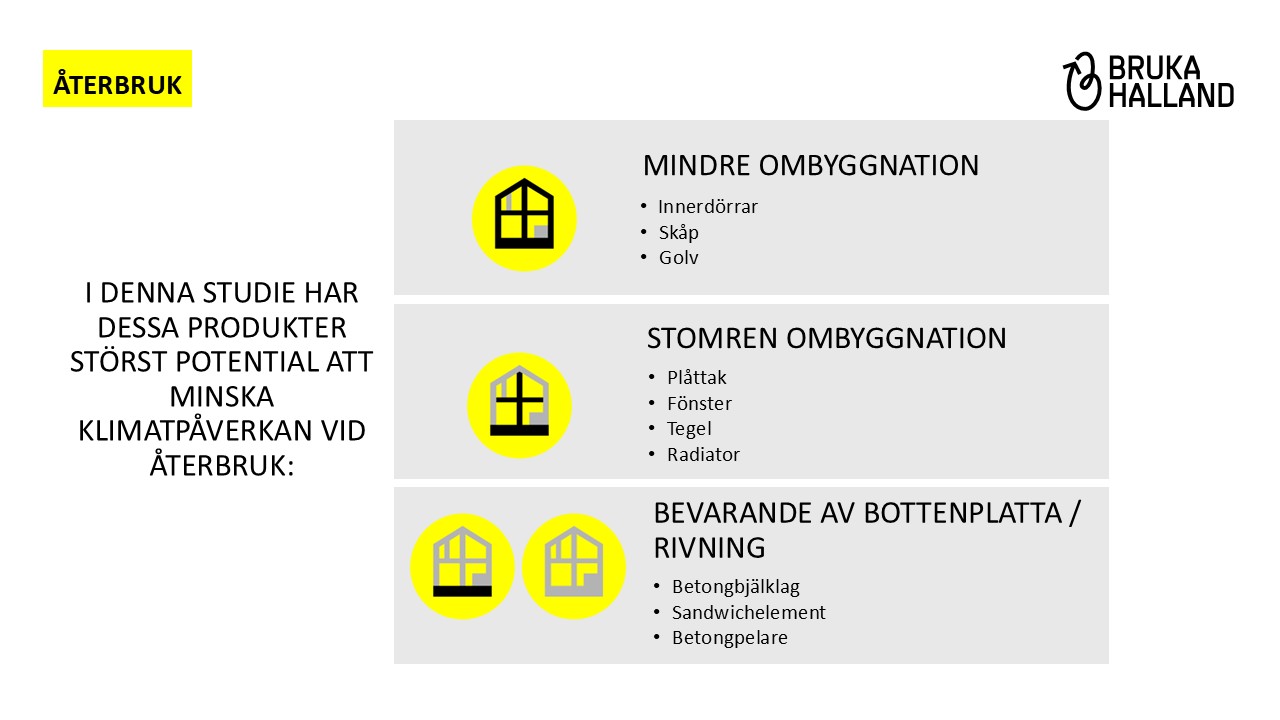 Man tittade också på vilka typer av produkter som har största potential för minskad klimatpåverkan vid återbruk. Bland dem hittar vi innerdörrar, skåp, fönster, tegel och betongbjälklag.