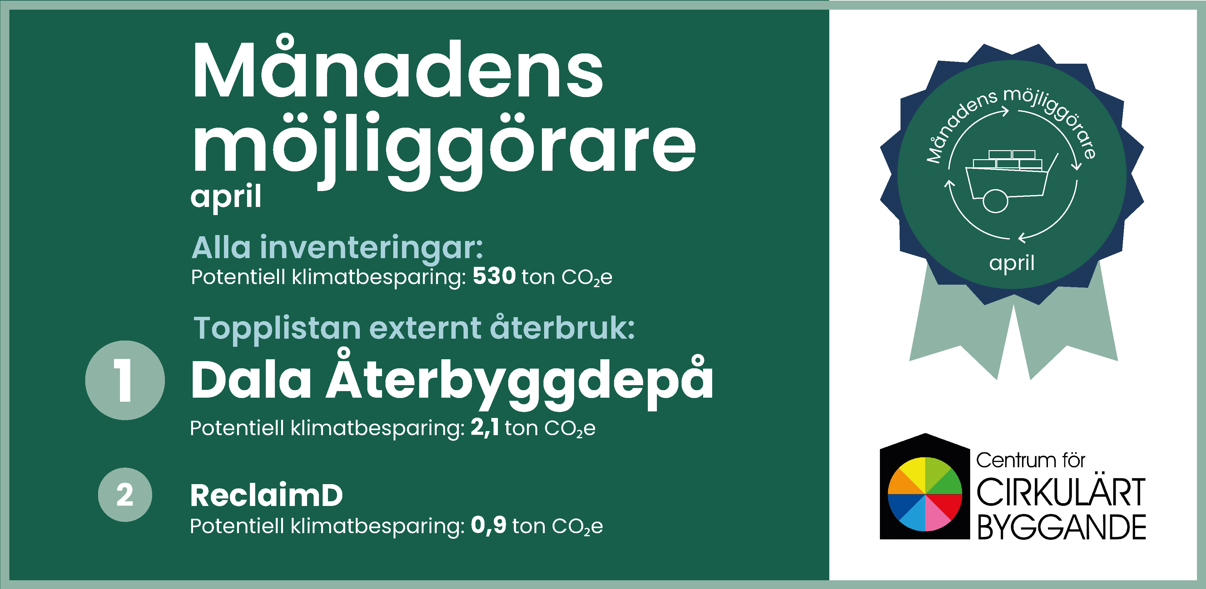 Under april hamnar Dala Återbyggdepå och ReclaimD i topp som Månadens möjliggörare genom sina publiceringar på marknadsplatsen. Grattis och bra jobbat hälsar vi på CCBuild!