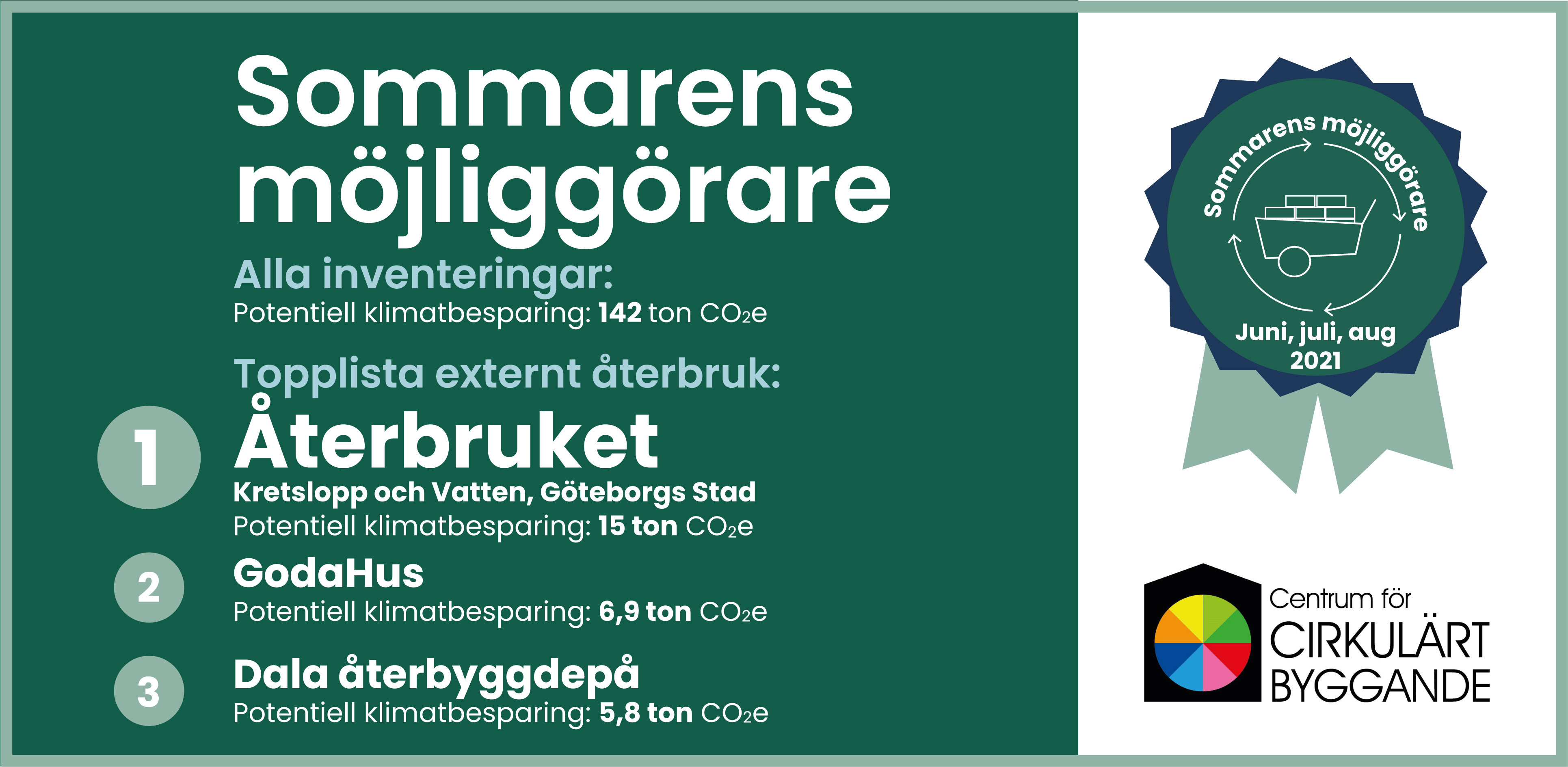 Återbruket tar inte semester. Det ser man på att CCBuilds produktbank har fortsatt att växa under sommaren, och på ett större utbud på marknadsplatsen av framför allt fönster. Totalt har våra användare de senaste månaderna inventerat produkter som kan minska utsläppen av växthusgaser med minst 142 ton.